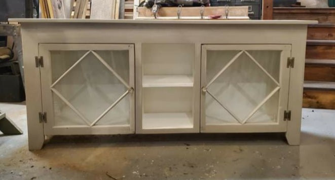 Don't miss out on this Unique Diamond-Shaped antique window console. Its design is unforgettable. A beautiful and functional piece for your entertainment pieces, to display an antique collection or storage of books or albums. It will make a grand statement in your home! (Antique glass knobs on doors)