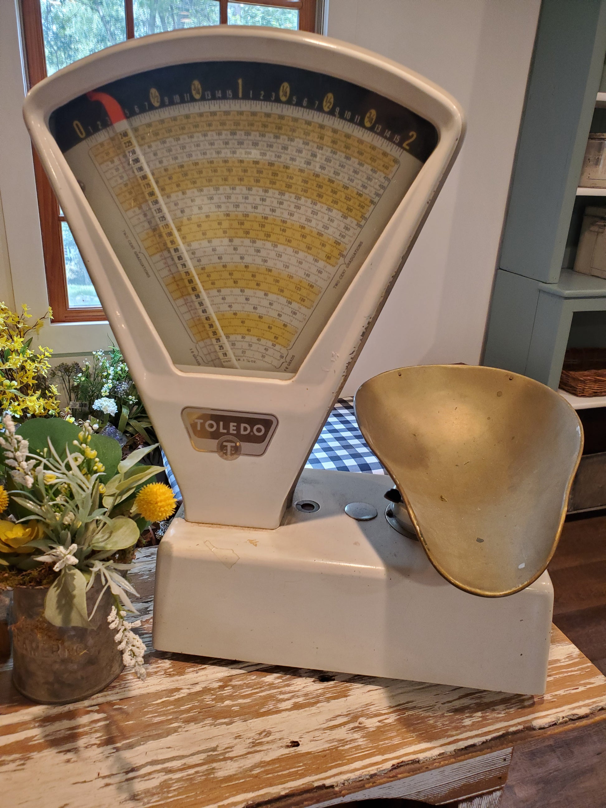 A fun Décor piece in a kitchen! Antique Candy Scale is in excellent condition. Add your favorite candy to the original brass bowl or add some florals and a candle for a decorative touch.