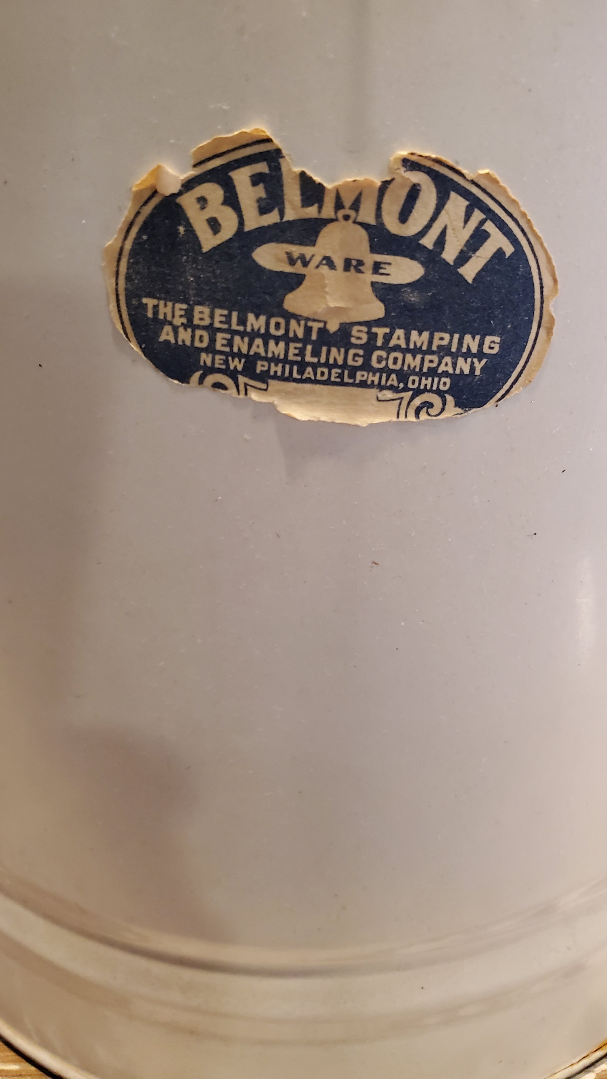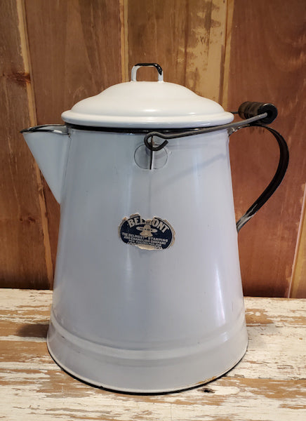 LARGE Old Enamel Coffee Pot is in great condition. Label shows age and has some wear but still intact.