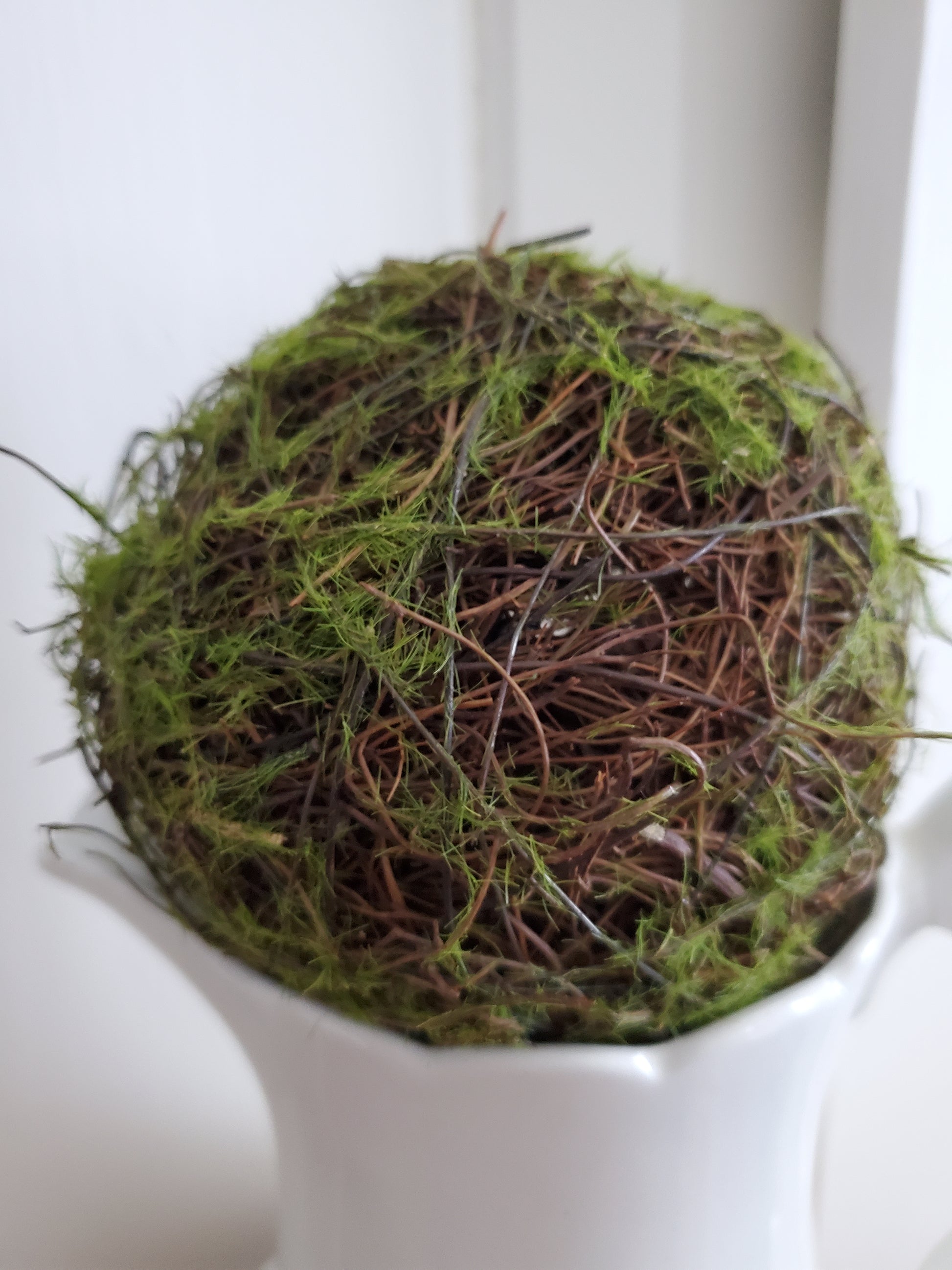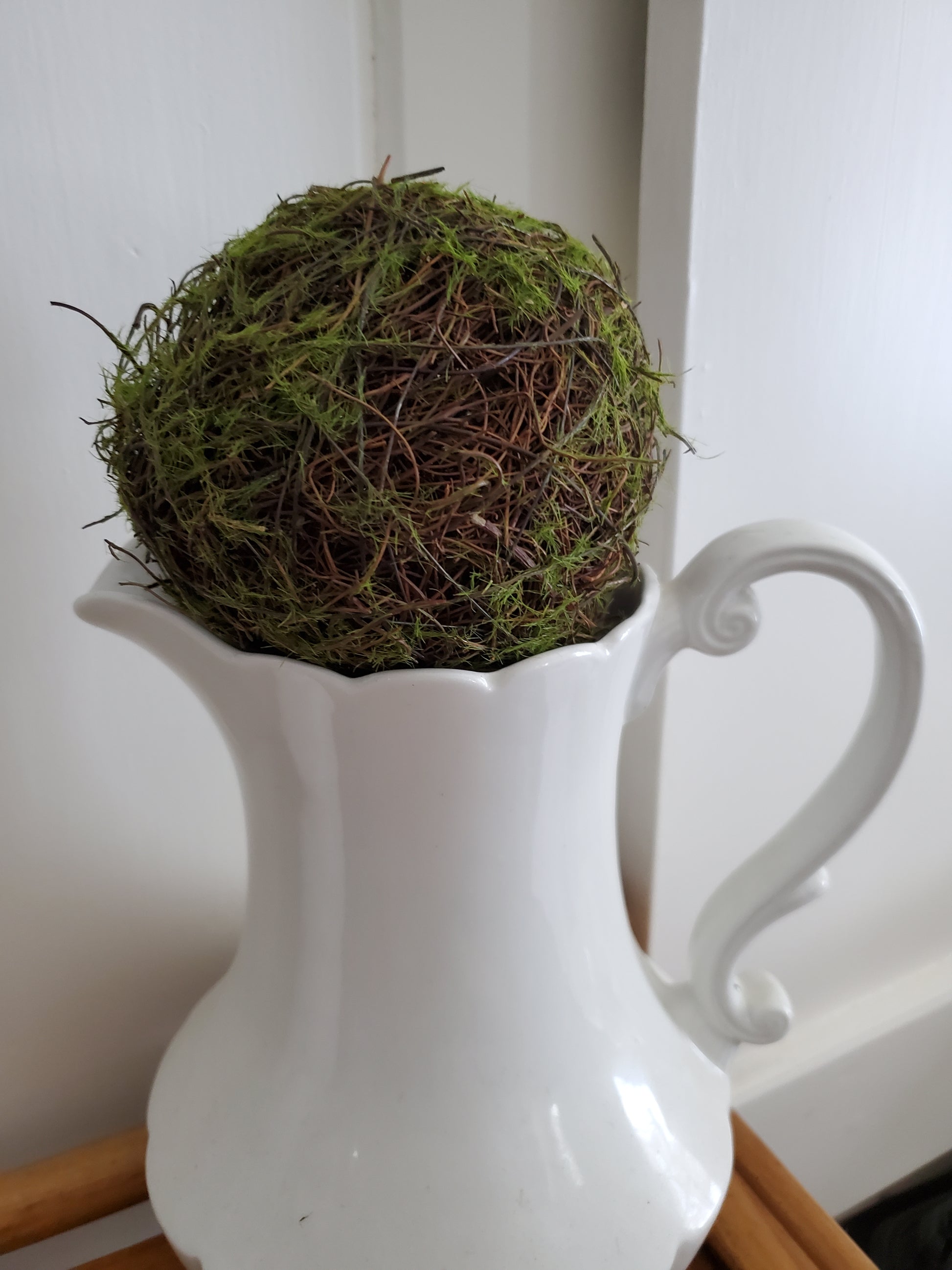 4" Moss covered Grapevine Balls- Use as a bowl filler or on top of a candle holder or pitcher (as shown) for some extra whimsy